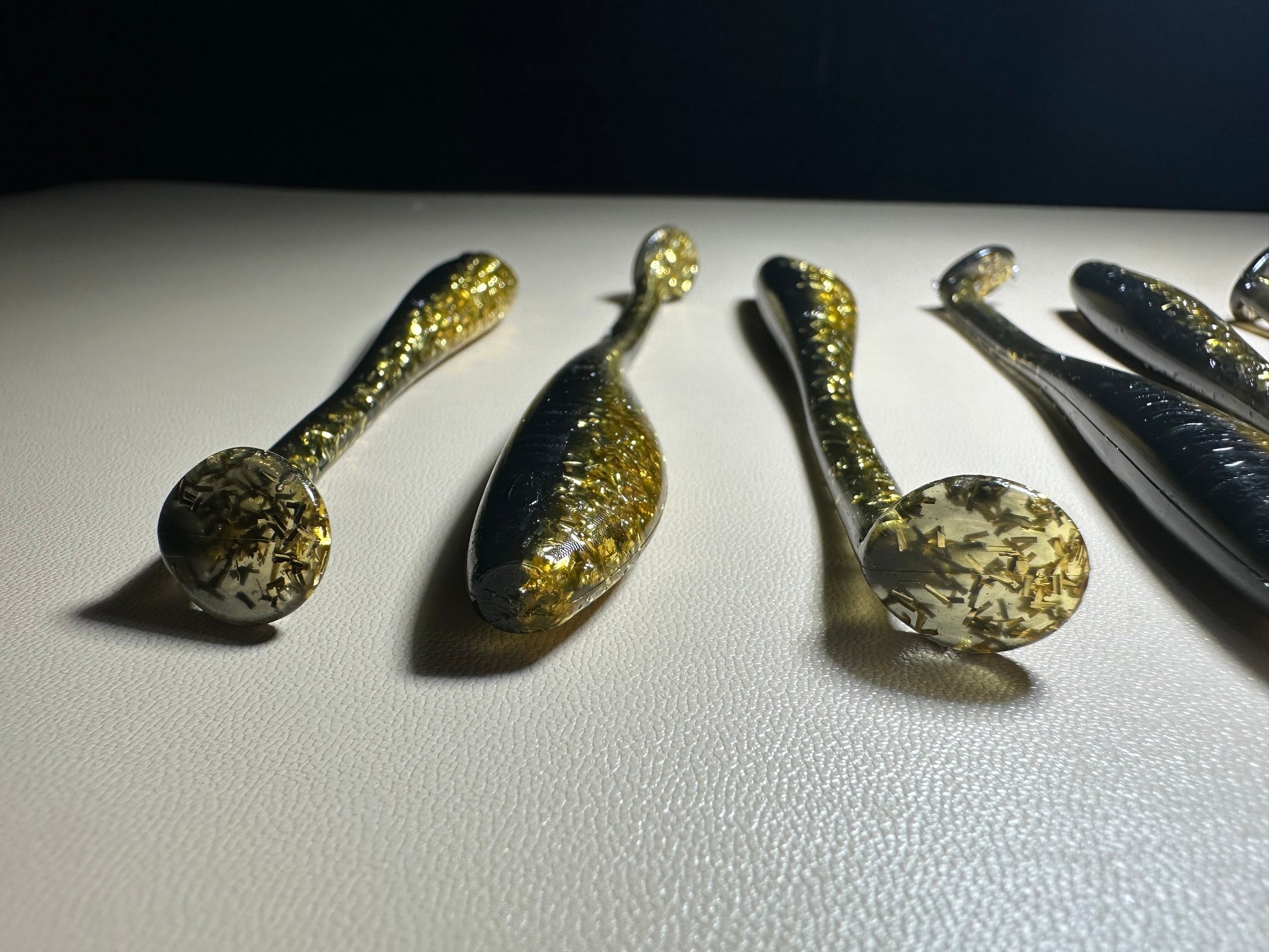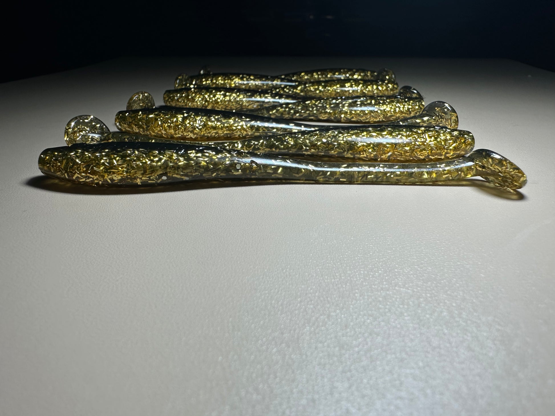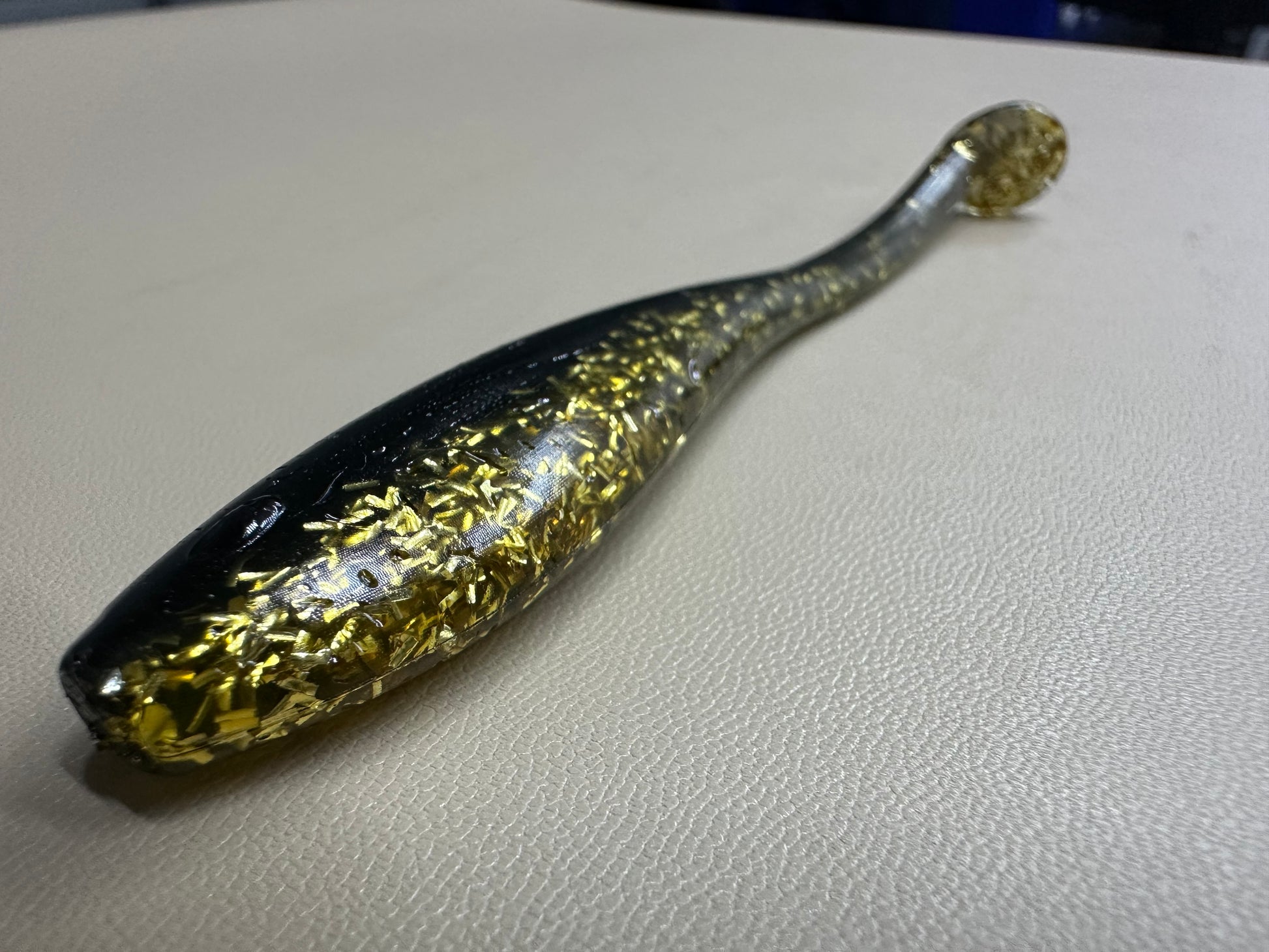 The color pattern—solid black on top with gold sparkle on the bottom—remains visible in dirty or clean water. Finished with a sweet watermelon scent, it encourages fish to bite and hold on longer.